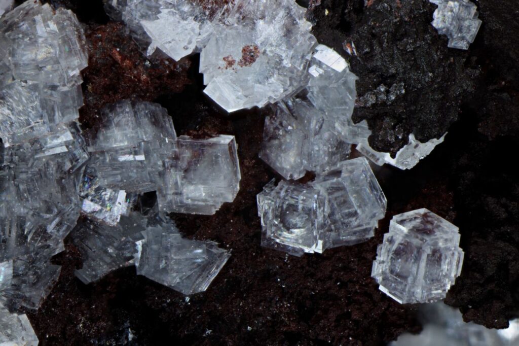 Colourless stepped rhombs. Note that these crystals are similar to photos of smithsonite from this locality on Mindat, except for the colour (the smithsonite specimens have a green tint). Width of view 5mm. Stack of 71 images.