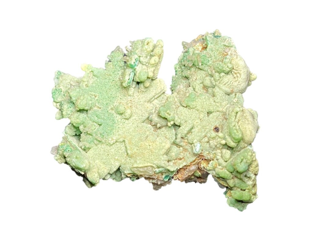 A neat reticulated cerussite specimen coated in tiny pyromorphite crystals. Sandwiched between the two is a bit of malachite. Specimen measures 48x45x22mm.