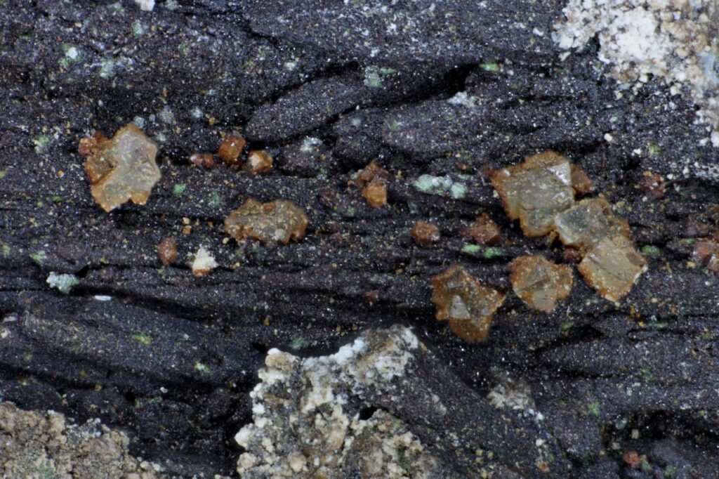 ncat WD218 Chabazite, Sulphur, Alabandite, Zinc Corporation Mine, Southern operations mine, Broken Hill, Yancowinna Co., New South Wales March 8, 2022 Pendleton Australasia Australia New South Wales Orange-coated pseudocubic crystals of chabazite and green sulphur crystals on alabandite. Width of view 5.75mm. Stack of 35 images. Click on the image below for a higher resolution version.