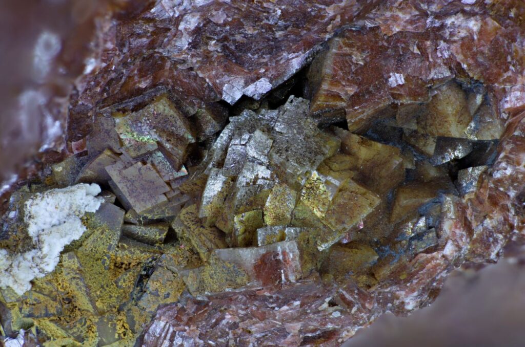 Multiple generations of dolomite. First chocolate-coloured rhombohedra, followed by a much paler (yellow-coated) layer over the same crystals (possibly just a change in chemical composition), with a final white opaque crust here and there. Also, some managnese dendrites bottom right of the photo. Ex John and Betty Weir. Width of view 11.5mm. Stack of 60 images.