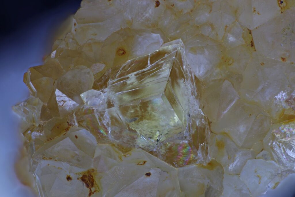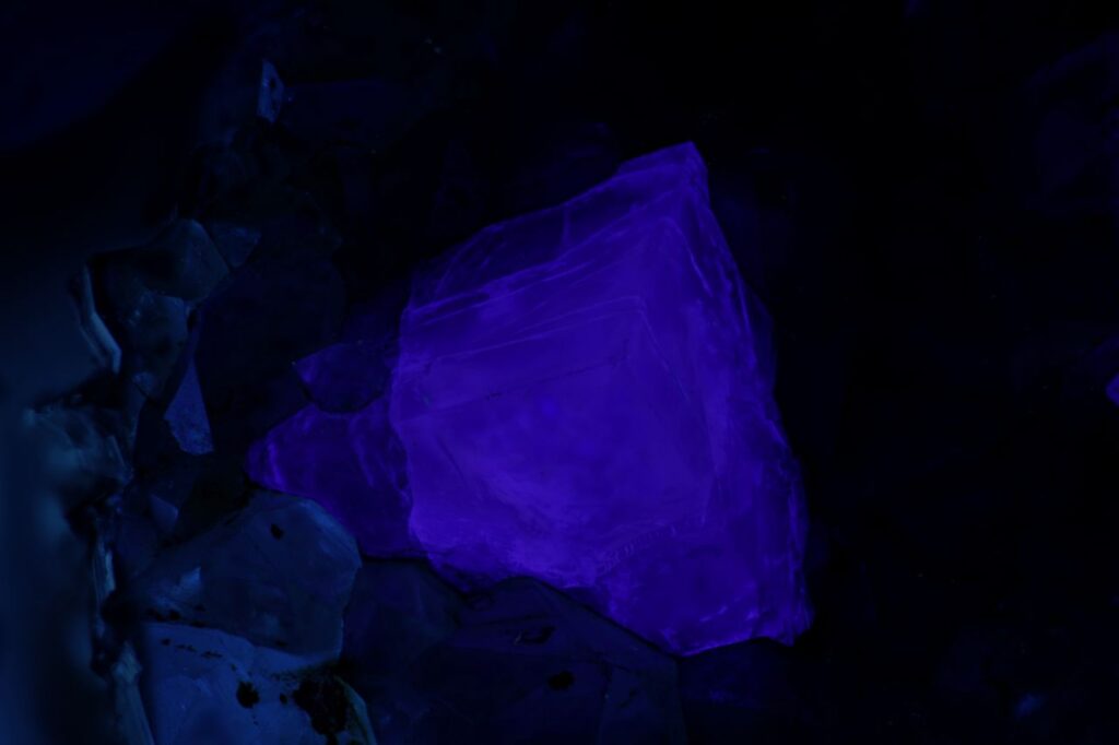 A single colourless fluorite (fluoresces) on quartz, with a quartz crystal on one face. Ex Art Smith Collection. Ex N. Peters. Width of view 11.5mm. Stack of 65 images (white light) and 11 (UV).