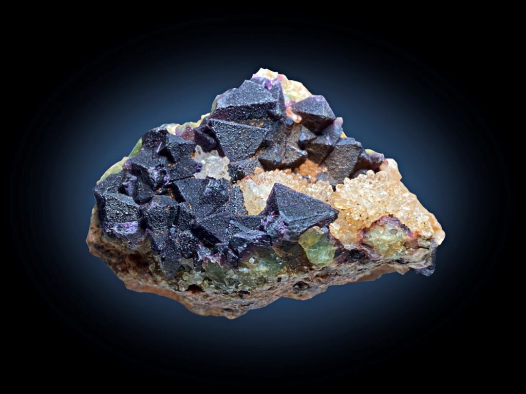 Dark purple over green fluorite octahedral crystals to 8mm with quartz. The green fluorite exhibits blue fluorescence under longwave ultraviolet, but not the purple fluorite. Specimen measures 53mm wide.