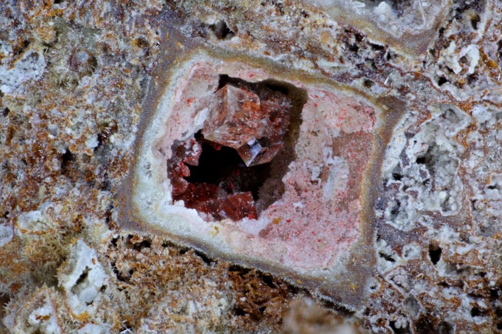 Tiny colourless fluorite crystals with red minium in a void that would have originally been a galena crystal. Also present, colourless to white acicular (calcium-rich?) pyromorphite crystals. Width of view 11.5mm. Stack of 100 images.