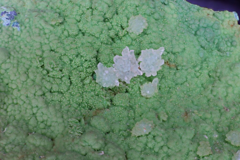 0372 Conichalcite, Quartz, Dome Rock Copper Mine, South Australia July 7, 2022 Pendleton Australasia Australia South Australia Small clusters of colourless quartz on a bed of conichalcite. Quartz crystals are uncommon. Width of view 11.5mm. Stack of 40 images. Click on the image below for a higher resolution version.