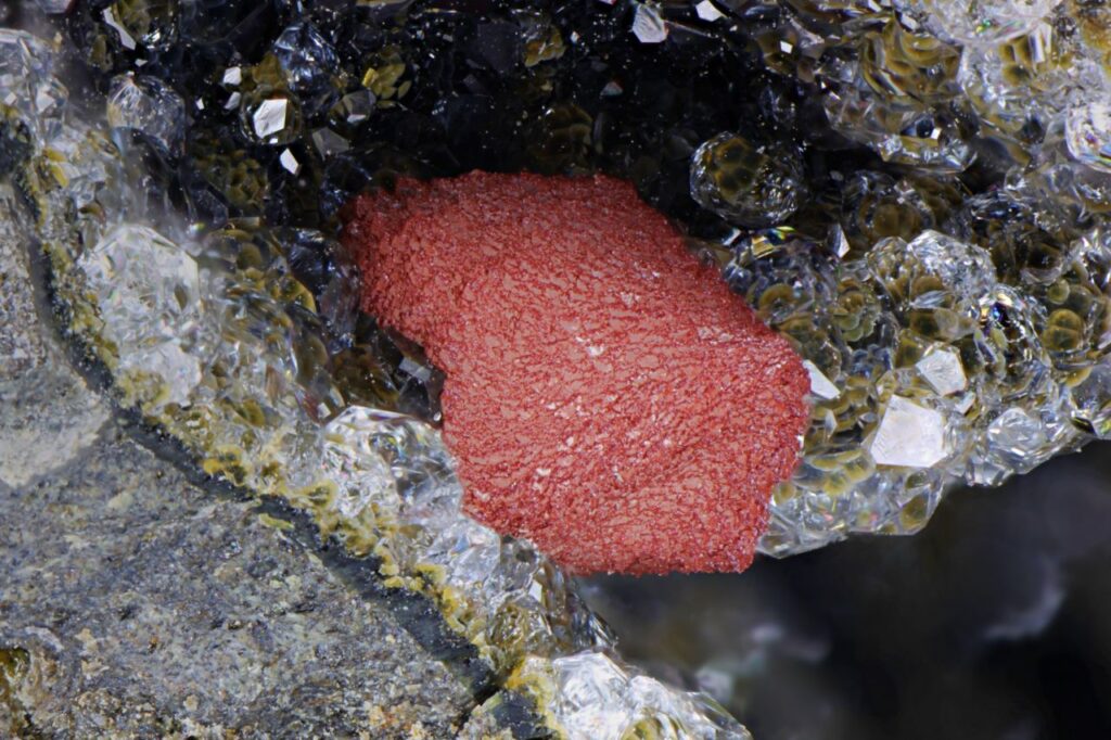 3867 Calcite, Analcime, Little Plains Quarry (Fieldwicks Quarry), Blue Tier district, Break O’Day municipality, Tasmania August 30, 2023 Pendleton Australasia Australia Tasmania This crystal is coloured by hematite. On colourless analcime. A nearby cavity has a colourless calcite crystal. Width of view 4.5mm. Stack of 90 images. Click on the image below for a higher resolution version.